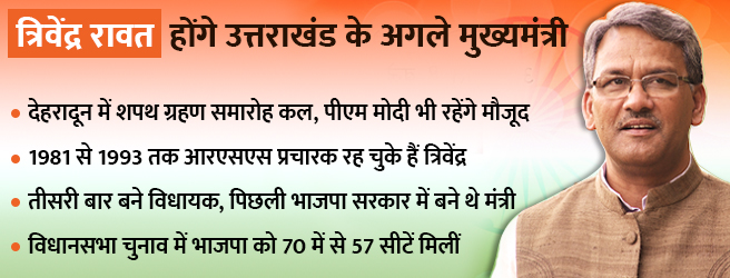आरएसएस के प्रचारक रह चुके त्रिवेंद्र सिंह शनिवार को प्रधानमंत्री नरेंद्र मोदी, भाजपा अध्यक्ष अमित शाह, जेपी नड्डा और उत्तराखंड प्रभारी श्याम जाजू की मौजूदगी में मुख्यमंत्री पद की शपथ लेंगे।