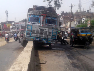 आजमगढ़-वाराणसी मुख्य मार्ग पर शहर के हरबंशपुर से लेकर सर्फुद्दीनपुर मुहल्ले तक सड़क के बीचो बीच डिवाइडर बना हुआ है। लोगों का कहना है कि जब से यह डिवाइडर बना है तब से आए दिन कोई न कोई वाहन टकरा कर दुर्घटनाग्रस्त हो रही है। अभी कुछ दिन पूर्व विश्वकर्मा मंदिर तिराहे के पास एक ट्रक डिवाइडर से टकरा कर पलट गया था। प्रत्यक्षदर्शियों का कहना है कि मंगलवार की आधी रात को इलाहाबाद से माल लदा एक ट्रक शहर की ओर आ रहा था। ट्रक चालक को अचानक झपकी आ जाने से ट्रक अनियंत्रित होकर सर्फुद्दीनपुर स्थित तिराहा के पास डिवाइडर से टकरा गया। दुर्घटना में ट्रक जहां क्षतिग्रस्त हो गया, वहीं चालक व खलासी बाल-बाल बच गए। दुर्घटना के बाद चालक व खलासी गाड़ी छोड़कर मौके से भाग गए। बुधवार की दोपहर तक ट्रक उसी हाल में मौके पर खड़ा था। ट्रक को सड़क के बीच से हटाने के लिए न तो ट्रैफिक विभाग ने सुधि ली और न ही पुलिस ने। जिससे जाम की स्थिति बनी हुई थी।