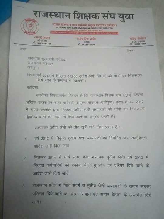 शिक्षकों की रैली का नेतृत्व राजस्थान शिक्षक संघ युवा के प्रदेश अध्यक्ष आर सी जाखड ने किया। रैली की वजह पूछे जाने पर प्रवेन्द्र कुमार मीणा एवं गजेन्द्र मोबारसा ने बताया कि साल 2012 में नियुक्त 40000 शिक्षकों का दो वर्ष का परिविक्षा काल सितंबर 2014 में संतोषजनक हो जाने के बाद भी सभी लाभ नहीं दिये जा रहे हैं। प्रत्येक शिक्षक साथी का लगभग 2.60 लाख का एरियर भी सरकार नहीं दे रही है।