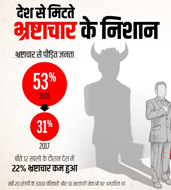इसके अनुसार साल 2017 में 31 प्रतिशत लोगों को सरकारी कामकाज में भ्रष्टाचार का सामना करना पड़ा जबकि साल 2013 में यह आंकड़ा 53 प्रतिशत तक था. इसके अलावा यह भी बताया गया है कि भ्रष्टाचार को लेकर लोगों की सोच और अनुभवों में भी पिछले 12 सालों (2005-2017) में कमी आई है.