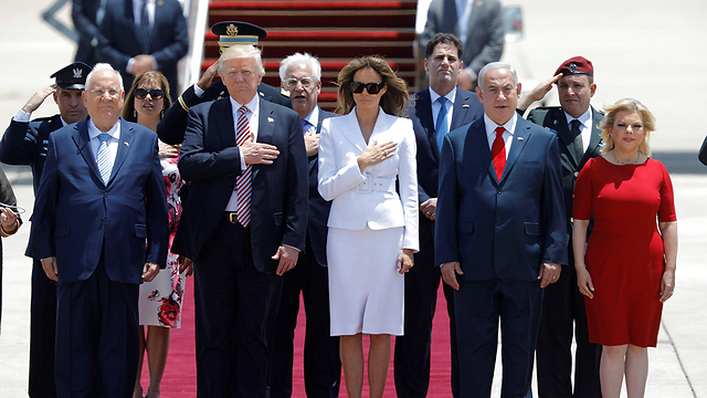 Upon deplaning, the American president walked the red carpet and reviewed an honor guard. The IDF’s band played the American national anthem followed by the Israeli one.